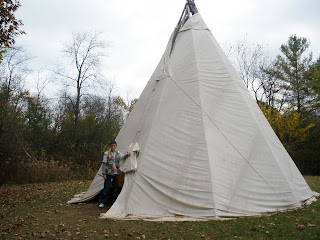 The boys have had quite a weekend - we went to the Fall Indian Guides campout where Sam tested for the "Haylushka brave" qualification and passed. He worked hard to memorize many things for the program over the past few weeks and we also did several projects together that were part of the Haylushka requirements. In one picture you can see him proudly pointing to the official Haylushka hat that he gets to wear to Indian Guide events now! :) In the other two pictures Sam is enjoying a cup of camp cocoa and Ben and I are checking out a tee pee that was set up at the camp.